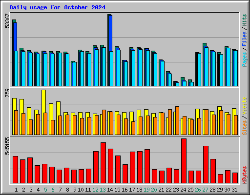| Day | Hits | Files | Pages | Visits | Sites | KBytes | ||||||